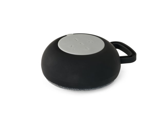 Caixa de som para escritório personalizada. ABS e tecido em poliéster. Com gancho e acabamento emborrachado. Transmissão por bluetooth. Autonomia até 3 h. Função para atender chamadas, controle de volume e conexão à playlist do dispositivo móvel. Incluso cabo para carregamento. Fornecida em caixa presente.