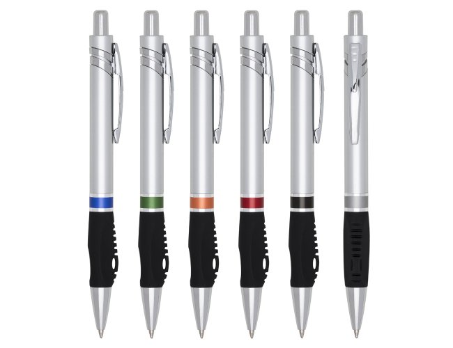 Caneta plástica inteira prata com detalhes em colorido. Clip de metal, possui anel colorido e parte inferior emborrachada com relevo. Aciona por clique.