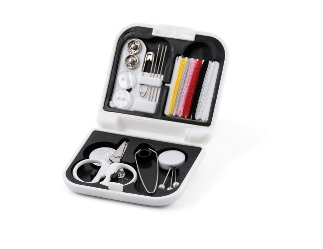 Kit de costura. Incluso linhas de cor, agulhas, botões, 1 tesoura, 1 enfia linhas, alfinetes. Fornecido em estojo. 70 x 21 x 65 mm