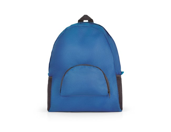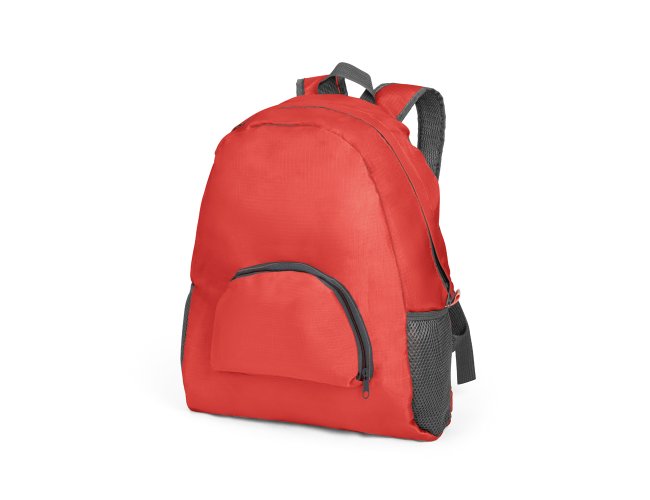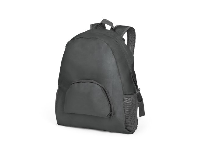 Mochila dobrável. 210D ripstop. Com bolso frontal. Dois bolsos laterais em tela. 330 x 400 x 120 mm