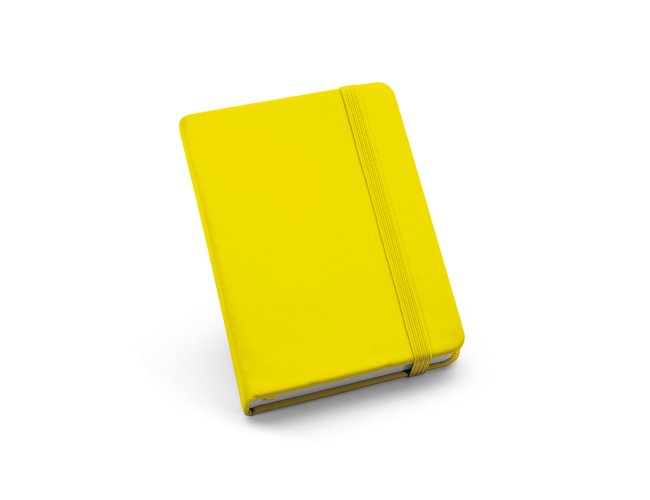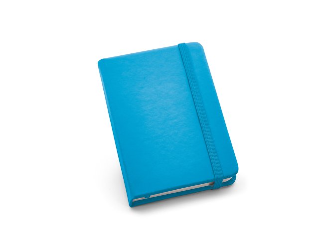 Caderno de bolso de capa dura em c. sintético. Com 160 páginas lisas, fita separadora e elástico. 90 x 140 mm