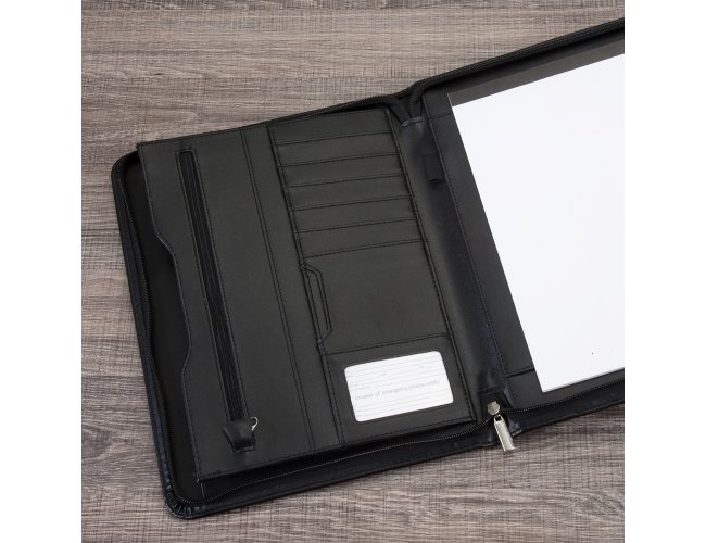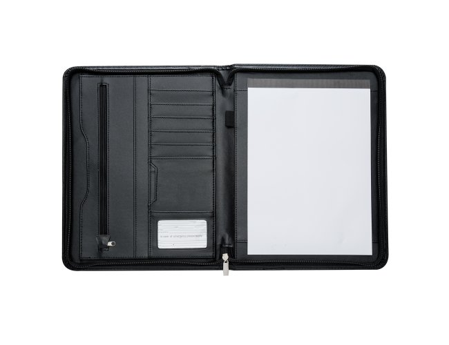 Pasta convenção de couro sintético com zíper, possui 2 compartimentos grandes para arquivar documentos, compartimento interno com zíper, 7 divisórias pequenas para documentos, suporte com visor para cartão de identificação, suporte para caneta(não acompanha caneta) e bloco com 20 folhas pautadas.