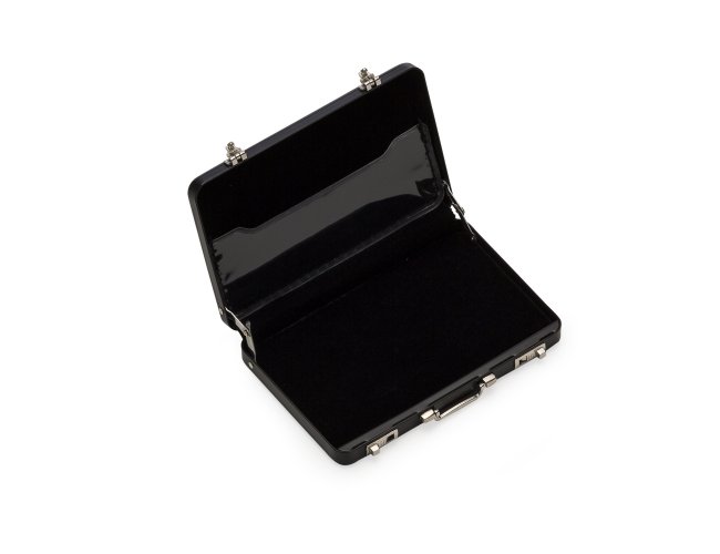 Porta cartão de alumínio formato mini maleta executiva. Possui dobradiças inferiores, alça e duas travas superiores, para abrir basta puxar os botões para as laterais sentido lado de fora. Possui quatro linhas em relevo frente e verso. Parte interna revestida de veludo com suporte plástico para cartão.