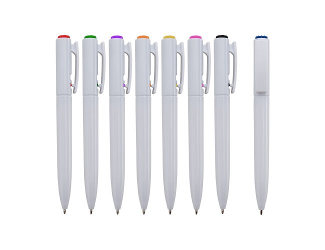 Caneta plástica corpo branco com detalhes coloridos. Clip plástico colorido e parte inferior com sete linhas coloridas.