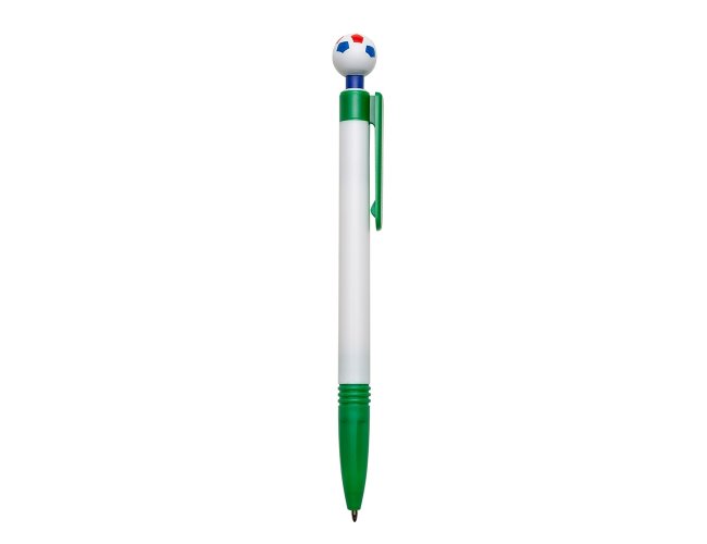Caneta plástica com acionador bola de futebol, possui corpo branco e detalhes coloridos. Ponteira com três anéis e detalhes em relevo, esferográfica azul com acionamento por clique.